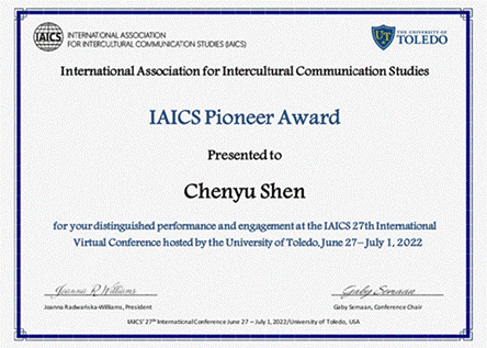 2022年6月27日至7月1日,由国际跨文化交际学会(IAICS)主办、美国托雷多大学(University of Toledo)承办的第27届国际跨文化交际学会年会以线上会议的形式召开。黑料网 博士生申辰瑜在本届会议中获得“先锋奖(Pioneer Award)”。“先锋奖”是国际跨文化交际学会年会于2022年首次设立与颁发的荣誉奖项,也是本年度会议颁发的唯一奖项,授予在会议期间具有优异表现以及对学会具备开拓性意义的参与者。本届“先锋奖”共有5...