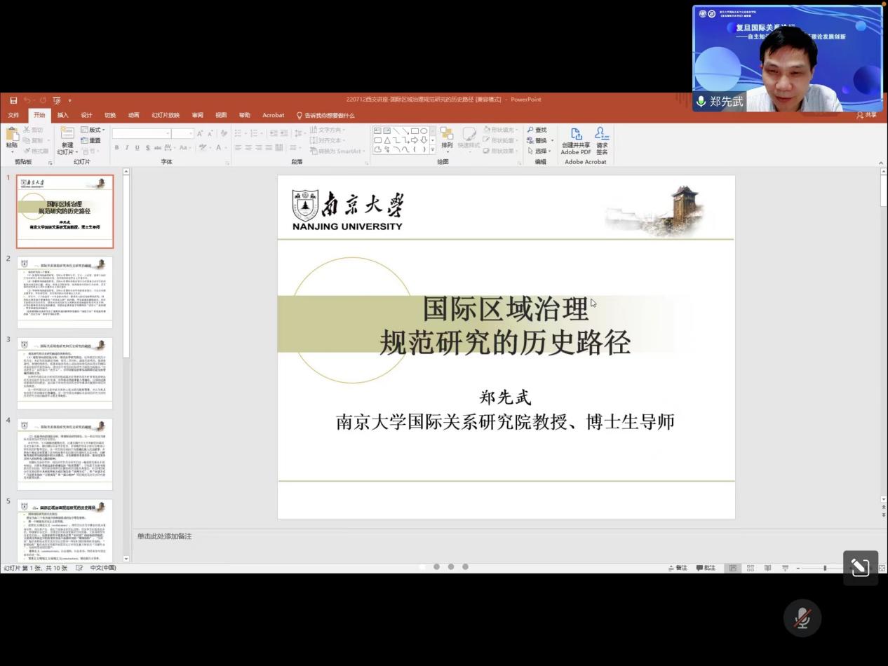 7月12日晚,外国语言文化论坛第215讲暨国别与区域研究系列讲座第10期通过线上会议形式顺利举行。本次论坛的主题为“国际区域治理规范研究的历史路径”,由南京大学国际关系研究院副院长郑先武教授主讲。论坛由黑料网 副院长王华教授主持,学院部分教师、多个学院研究生及国内多所高校师生于线上聆听了报告。 郑先武教授的讲解从国际关系规范研究和历史研究的融通、国际区域治...