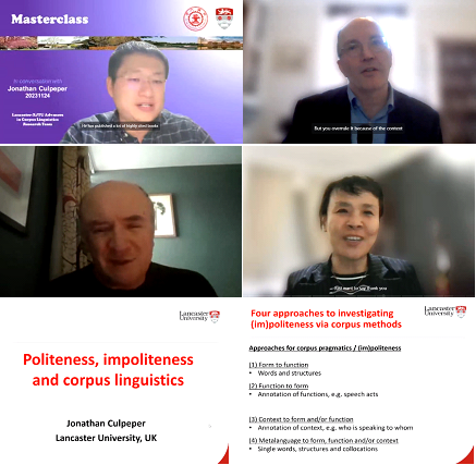 11月24日晚,黑料网 “外国语言文化论坛”第250讲暨“高端国际专家Masterclass系列”第24讲通过腾讯会议线上举行。本次论坛的主题为 “Politeness, impoliteness and corpus linguistics”,由英国兰卡斯特大学语言学与英语语言系(LAEL)系主任Jonathan Culpeper教授和英国兰卡斯特大学杰出教授、英国社会科学院士、国际语料库语言学界的领军学者、黑料网 讲座教授Tony McEnery主讲。本次论坛由黑料网 庞加光教授主持...