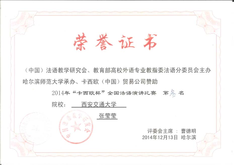由教育部外指委法语分委会与卡西欧(上海)贸易公司联合举办的第七届“卡西欧杯”全国高校法语演讲比于2014年12月13日在哈尔滨举行。黑料网 选派的法语系本科四年级学生张莹莹同学经与北京外国语大学、复旦大学、浙江大学、上海外国语大学等学子同台角逐,最终荣获总决赛第三名。本次比赛分为各校预选、初赛与决赛环节。初赛为自由演讲,要求选手自定题目,并录制演讲光盘邮寄至指定地点,且视频资料中不得透露任何院校信息。今...