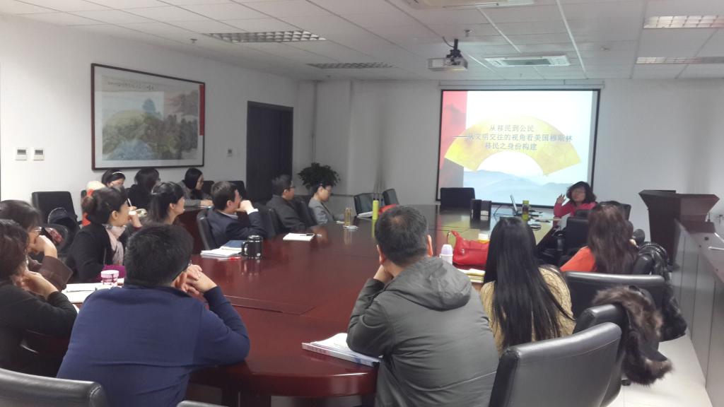 2015年11月19日下午研究生英语教学中心在外文楼B912举办学术论坛。此次学术论坛的主讲人是该中心的范文娟老师,讲座题目为“从多维度视角看美国中东南亚穆斯林移民之身份构建”。范老师从选题意义、美国穆斯林的人口与构成、族群认同、宗教认同、国家认同、身份构建与文明交往等方面进行阐述,分析美国中东与南亚穆斯林移民从移民走向公民的身份构建历程。中心教师在聆听讲座后积极提问,大家结合当前欧洲难民等问题展开了广泛的讨论。