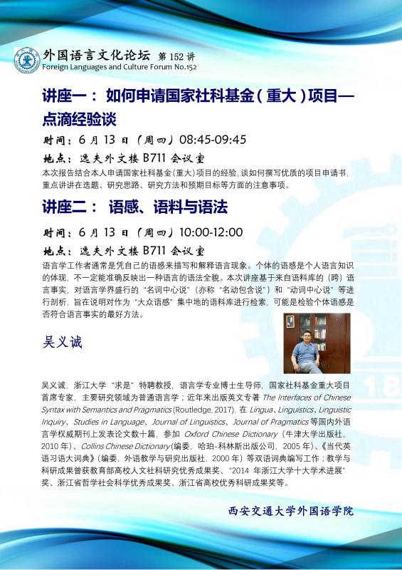 外国语言文化论坛(第152讲)—讲座一: 如何申请国家社科基金(重大)项目—点滴经验谈;讲座二: 语感、语料与语法