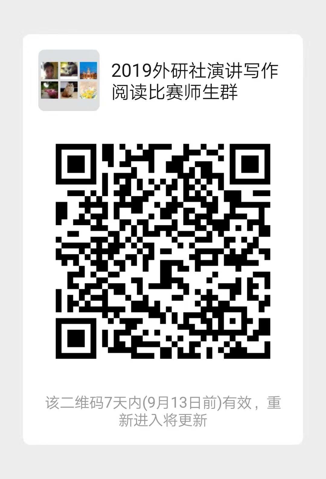 本科及研究生均可报名参加这三项大赛,请打算参赛的同学阅读附件中的大赛通知,登录大赛官网了解更多大赛详情。请扫描下方二维码加入“2019外研社演讲写作阅读比赛师生群”微信群,关注群里发布的比赛信息。