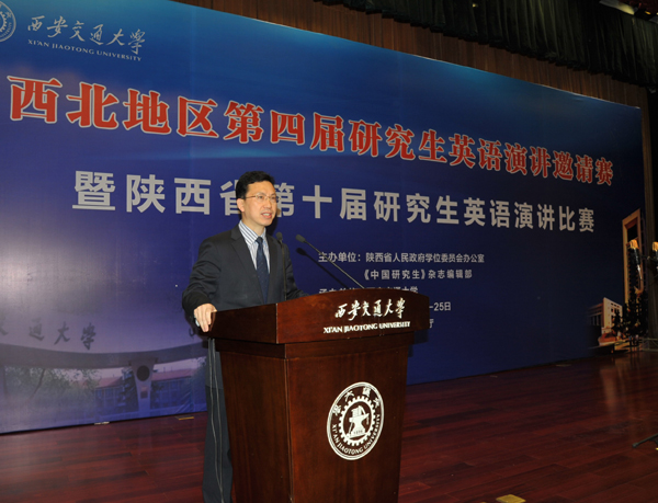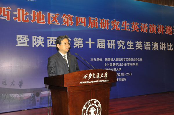 郑庆华副校长分别致辞,陕西省研究生外语教学工作委员会主任郭继荣教授致辞并介绍了比赛报名及组织情况,最后,陕西省教育厅李兴旺厅长宣布比赛开始。