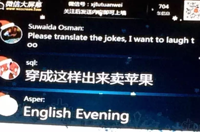晚会中的微信墙是本次英语之夜不得不提的另一大亮点,全场观众在微信上一起互动,笑声不断,欢乐不断。