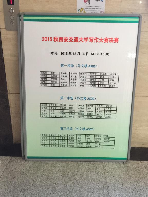 2010级至2015级同学,最长作文达到1080个单词,平均分数达到76.42分。通过2015年11月9日至11月16日复赛,共有118位同学进入了决赛。2015年12月13日下午2:00—4:00复赛在外文楼A505—507举办,101同学参加了本次决赛,决赛前,部分同学询问因为和专业课程冲突、国防生参加冬训等原因不能参赛能否有补赛的机会,足以证明同学们对于本次写作大赛的重视。