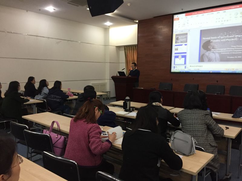 报告中,张扬教授主要阐述在语言研究中如何应用脑科学技术对大脑的在线活动进行检测。针对目前认知神经科学应用的研究手段和技术,张扬教授进行了详细的解释和优势对比,包括正电子发射断层扫描(PET)、核磁共振动(fMRI)、脑电(EEG)、脑磁(MEG)等技术。何为脑电?张教授表示,大脑皮层神经元具有生物电活动,因此大脑皮层具有持续的节律性电位变化,称为皮层自发脑电活动。而利用与事件相关的刺激可以产生诱发电位,借助电极导联以及平均叠加等技术即可记录、分析认知过程中大脑的神经电生理变化。脑电技术在语言研究中如何发挥作用?以明尼苏达大学Zhang Lab开展的一系列实验为例,张扬教授对如何运用认知神经科学手段进行语言习得和语言病理的大脑神经机制研究做了具体例证分析。此外,张扬教授还对儿童语言发展、耳蜗移植、自闭症、阅读障碍症等方面的原创脑电研究作出简洁明了的介绍。张教授的精彩报告引发与会师生的强烈兴趣,针对脑科学技术在语言研究中的具体应用,现场师生互动交流十分热烈。