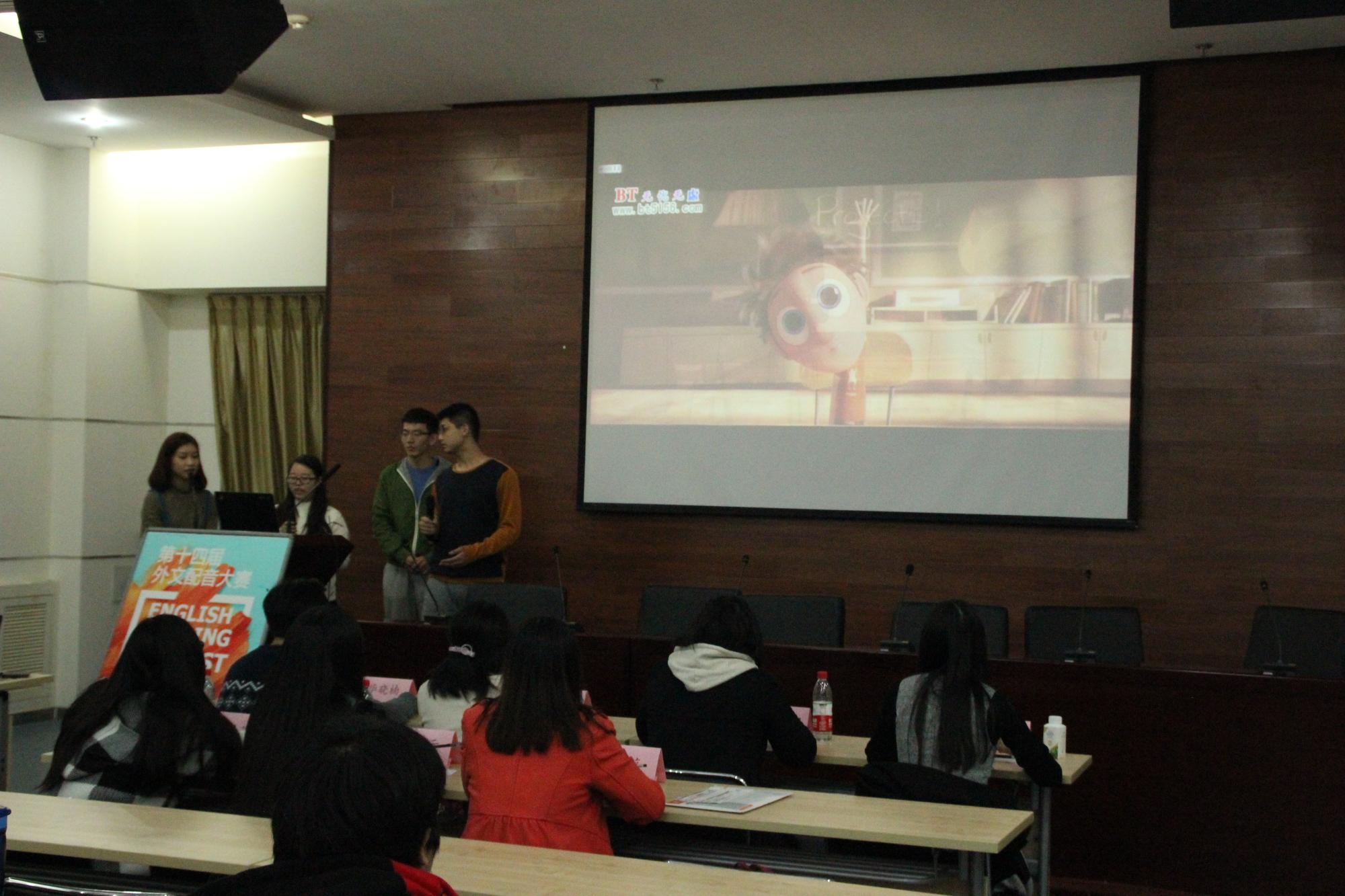 11月18日晚,第十四届金秋外语节外文电影配音大赛决赛在外文楼B座10楼报告厅举行。12组参赛选手经过11月12日和13日的选拔,从50组初赛选手中脱颖而出。