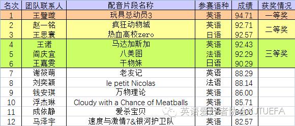 决赛中各组选手的声音极具特点,将电影中的角色还原得十分完美。英语组的《Cloudy with a chance of meatballs》首先登场,并立刻博得了满堂彩。日语组的《爱杀宝贝》萌点十足,三位女生可爱的配音立刻融化了在场男同学的心。法语组的喜剧《le petit Nicolas》笑点密集,轻松自然。在场观众不断鼓掌欢呼,为优秀的配音选手喝彩。经过一个半小时的精彩角逐和评委的认真打分,共评选出一等奖一组,二等奖两组,三等奖三组。
