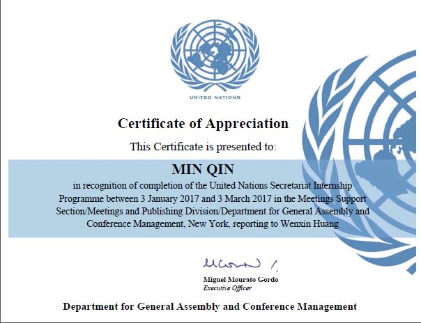 鉴于秦敏同学高质量的实习工作,DGACM向她颁发了“优秀实习证书”。黄文新校友在给外院的实习生反馈邮件中写道:“秦敏同学英汉双语和翻译基本功扎实,勇于挑战高难度工作,并比照联合国语言部门的标准和规范,进一步锤炼和提升了自身能力。可以预见的是,由于她的努力,联合国国际法委员会的相关报告和讨论,将会更好地以中文得到传播。”同时,黄校友表示,希望母校能够继续选派品学兼优的同学支持联合国实习生的选拔工作。
