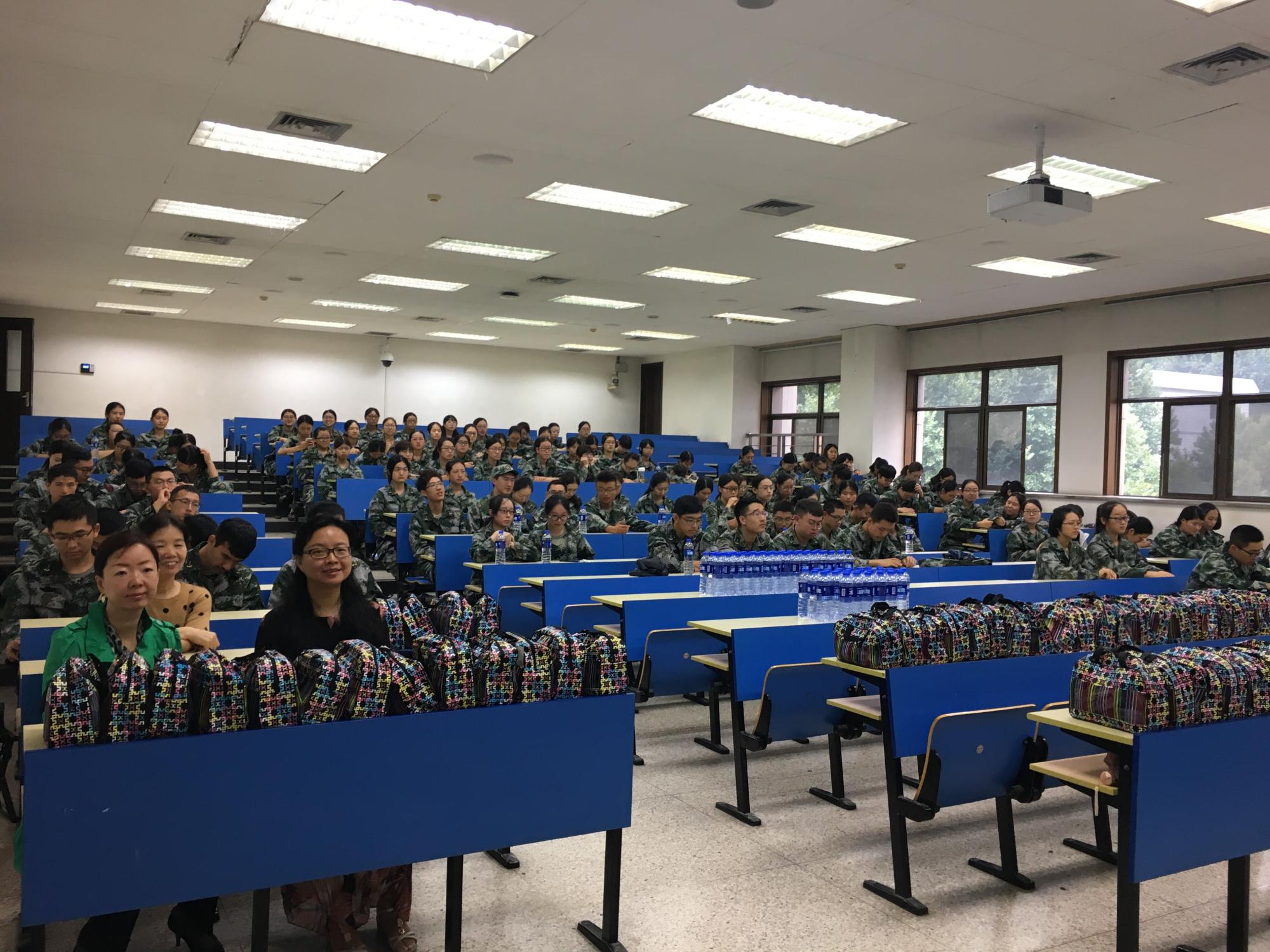 学院领导老师为军训教官和指导员发放慰问品,随后逐一为每位学生发放慰问品。