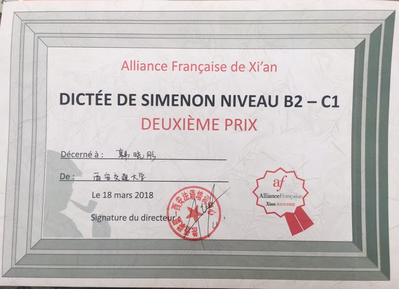 法语专业四年级韩晓彤同学所在的B2/C1组听写内容难度非常高,对语法、词汇量、理解能力等均有较高要求。最终,韩晓彤获得了该组第二名的好成绩。