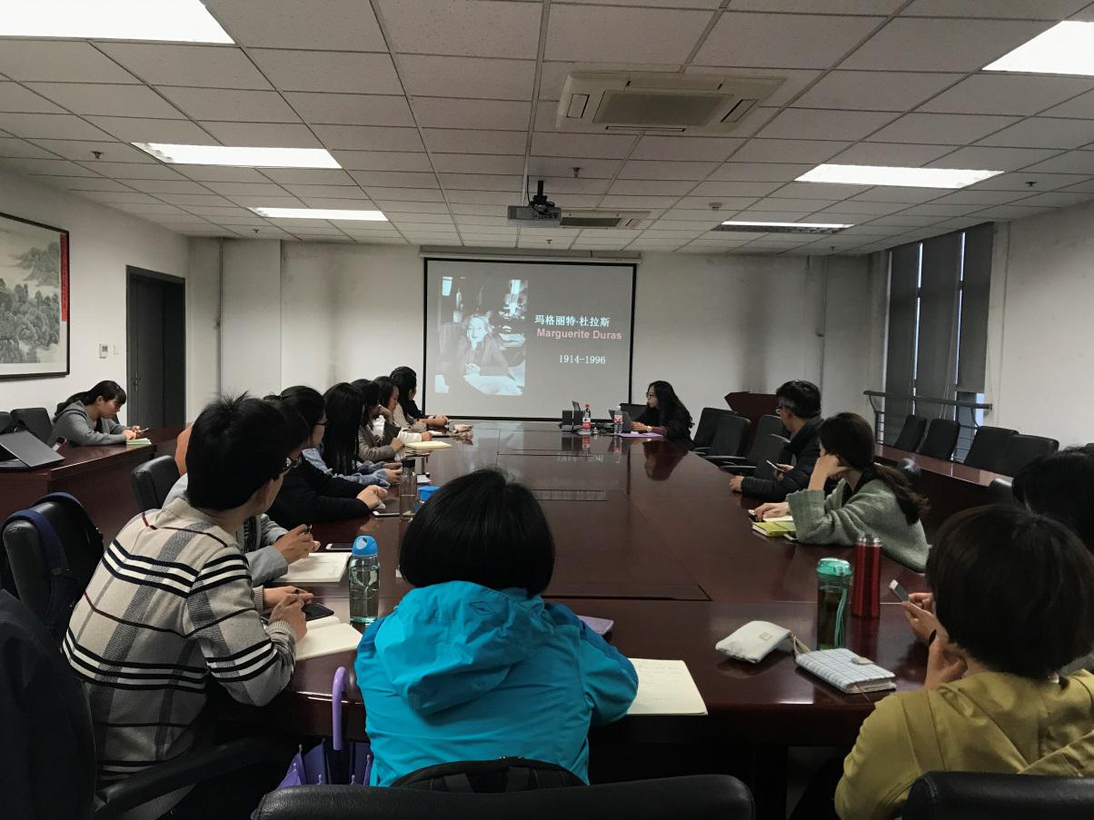 师生做题为“恒河魅影—杜拉斯小说世界背后的神话隐喻”的讲座,法语、日语、英语等专业的师生参加到此次讲座中。
