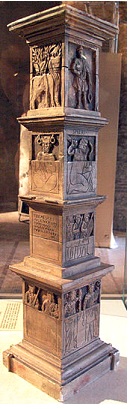 这就是建于公元1世纪的“航夫碑” (Pilier des Nautes)。是1711年巴黎圣母院祭坛重修时,在其地基内发现的。通过石碑上的浅浮雕和文字,我们知道,该碑建于古罗马第二任皇帝提比略时期(公元14年-37年),由高卢富庶的航夫商会出资,放置在祭坛上献给众神之主朱庇特的。碑上的浅浮雕均为高卢和罗马神祗,还有赞颂朱庇特和提比略的文字。该碑复原后高度为5米,由四部分组成,每块方石的四面均有浮雕,是法国最古老的雕刻建筑。