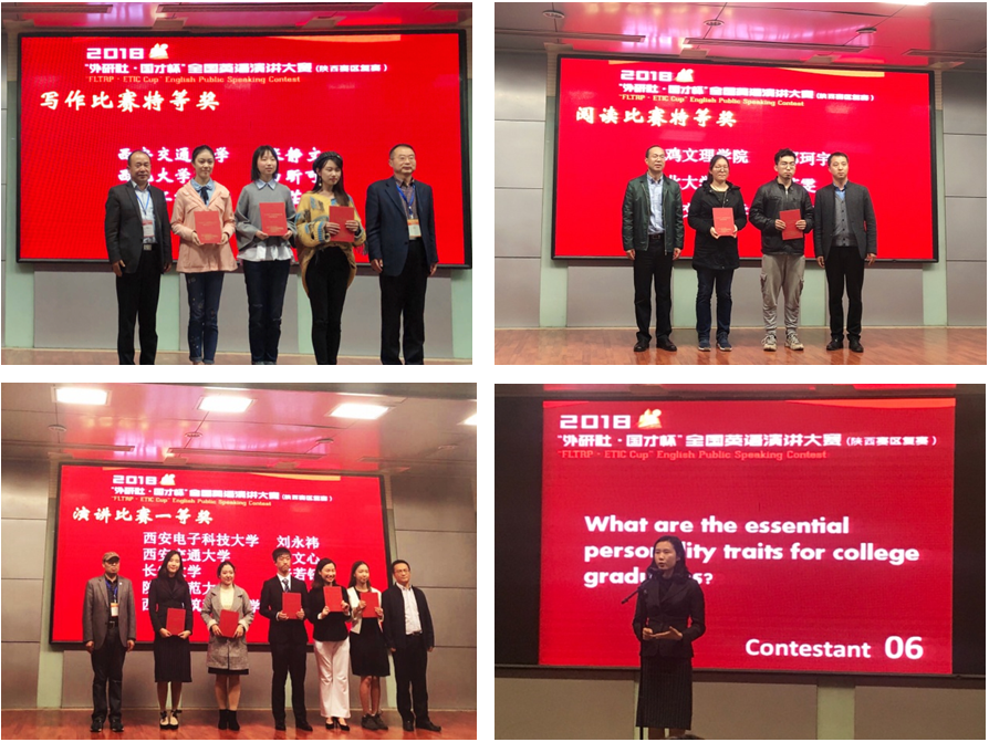 英语写作比赛中,来自英法专业的张静文同学凭借出色的思辨能力和扎实的语言功底,一举获得了比赛的特等奖第一名;在考察逻辑思维和文学积淀的英语阅读比赛中,电气工程及自动化专业的杨航同学也获得了特等奖的优异成绩,二位同学将代表陕西赛区角逐今年12月在北京举办的全国总决赛。在扣人心弦的英语演讲大赛中,英法专业的杨文心同学,在两轮比赛中都沉着应战,最终获得大赛一等奖。写作大赛指导老师范晓晖老师、邵娟老师、彭凤玲老师,阅读大赛指导老师许梅老师、马丽娜老师、曹浩煊老师和演讲大赛指导老师常虹老师等也荣获优秀指导教师奖。