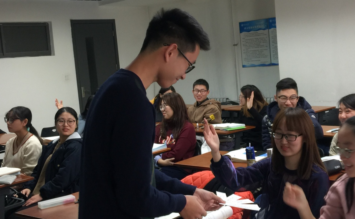 在实验周,每天的课程内容和课堂组织形式均有所不同。同学们设计了不同的课堂环节,台上台下融为一体,互动充分、气氛融洽、衔接紧凑、学习效果显著。同学们的探索精神、求新求异的想法令人欣慰。这一周师生均有意外收获。课堂形式的多样性探索带来不同的惊喜。传统教学长于稳扎稳打,一步步引领学习者由浅入深、循序渐进。易于学习者接受,也比较符合普遍的学习心理需求。但是这种方法难以深度激发学生的探求欲。学生如何高效掌握学习内容并迅速内化?让他们全身心投入到问题探索和不断练习中,不失为一种有益的尝试。学生通过行动加入到问题的研究中,每一次努力,每一个步骤都带给他们满足感和成就感。这种多维互动式教学使学生处于积极主动状态,课堂气氛活跃、教学效果好。教学中不同的方法可以交替使用,使学生不断有新鲜感,并且各种教学手段可以取长补短。