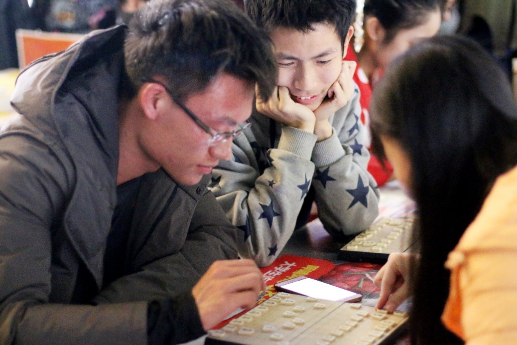 图为参与者了解中式传统五子棋和日式传统将棋来源与规则