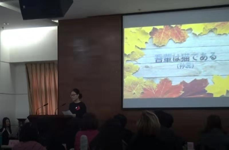 比赛环节,首先是日语系一年级学生和其他专业同学同台的朗读大赛:郑博文、谢晴、赵翎君等选手用流利的日语为我们朗读了《绿色之窗》,清新的气息扑面而来,重章叠句中将诗歌的韵律和美感演绎得淋漓尽致;常凯娜、李祎然、孙蕊、吴纯纯等四位选手为大家带来夏目漱石的《我是猫》,趣味盎然;能动学院的刘洋选手则为大家带来了别开生面的日语版《沁园春·雪》,让我们感受到用不同语言演绎出不同风格品味的奇妙。