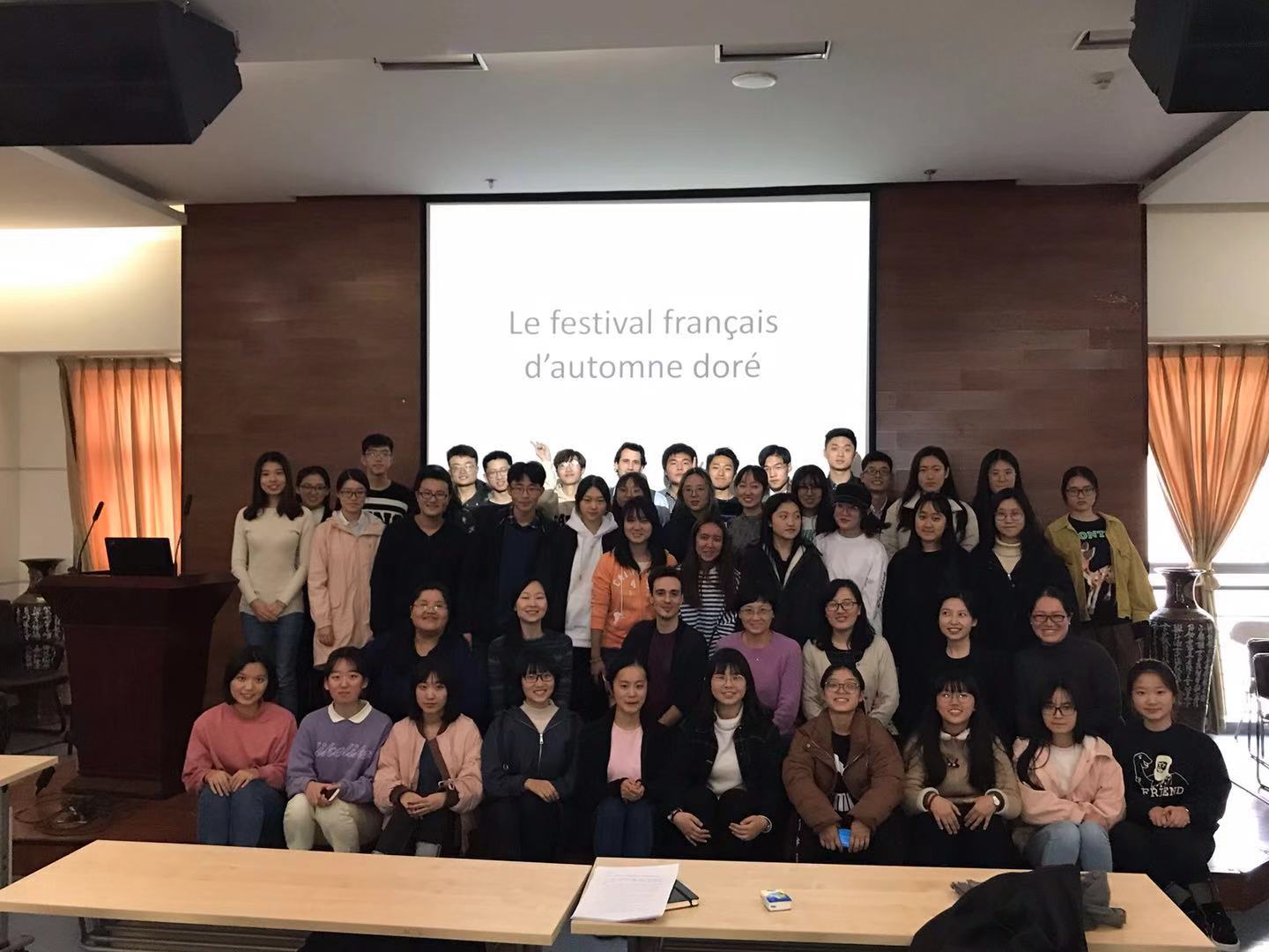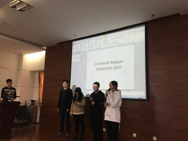 第十六届金秋外语节法语风采大赛于2018年11月28日下午在外文楼十楼报告厅火热举行。法语系同学和英法班的同学共同参加了这次活动。评委为法语系中方教师王奕、郭琳、寇媛媛、樊静薇、李文君、孟丽娜和法国外教Adrien Aragon、Pierre Martin。