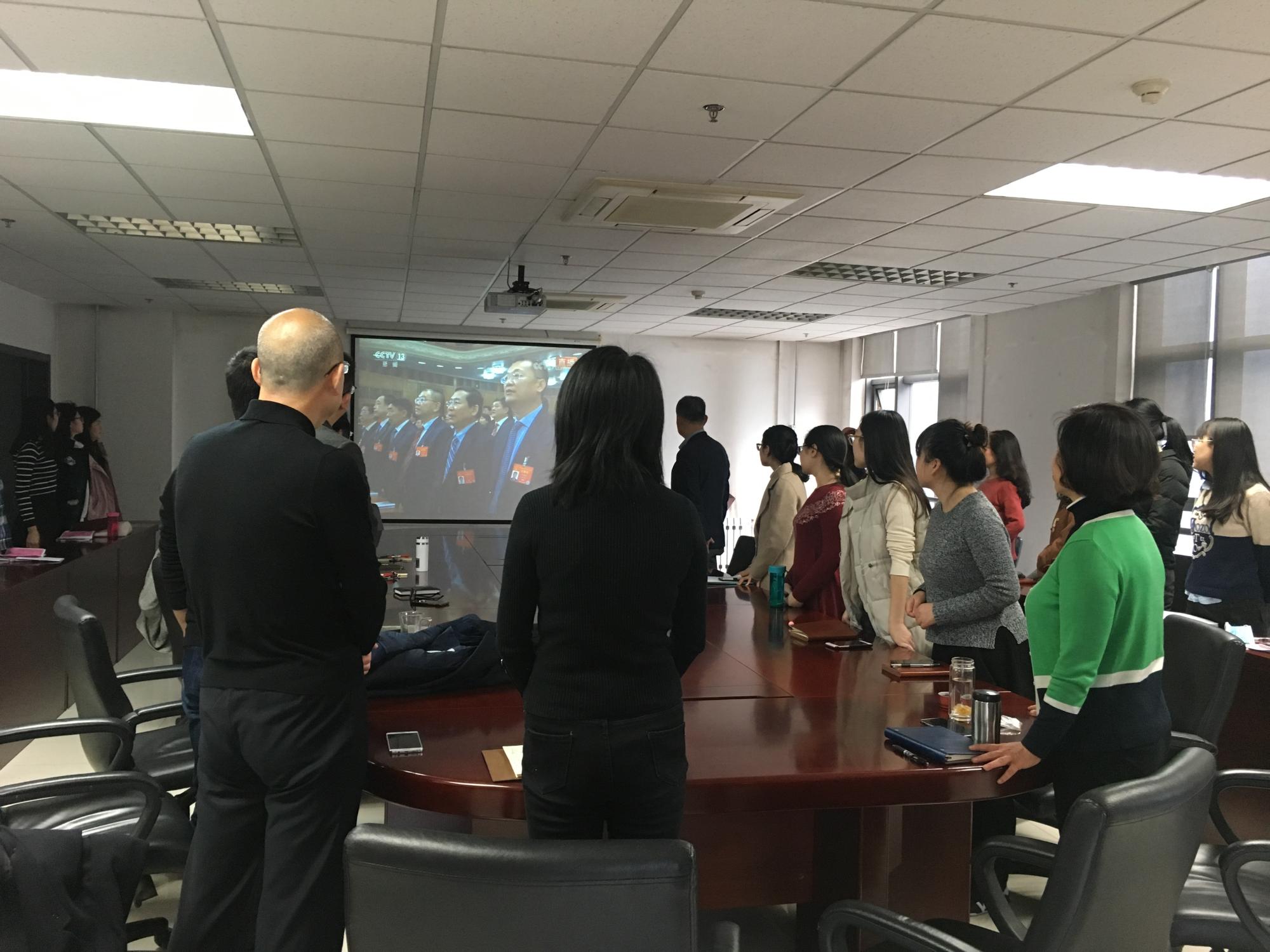 师生在外文楼B-912会议室集体观看十三届全国人大二次会议开幕,聆听李克强总理作政府工作报告。