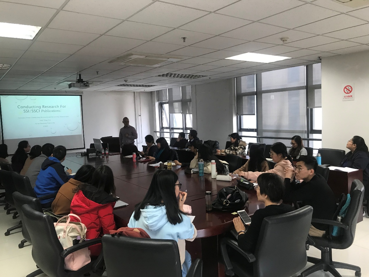 授予仪式结束后,谭兴教授为教师、硕博研究生们做了题为“如何发表SCI、SSCI论文”的讲座。他首先简要介绍了自己的学术研究历程,并从自己多年发表论文总结的经验角度为学生们梳理了发表顶尖期刊论文的一般准备步骤,指出从提出研究问题到设计实验,再到写论文、反复修改直到最终投稿是一个历时一年甚至更久的过程。他着重强调了选题、设计、写作三个方面的重要性,提出选题要可研、要具体、要前沿,实验设计要具有全面性、复杂性和艺术性,而论文的写作则需要有逻辑性,并充分考虑读者的同步性。