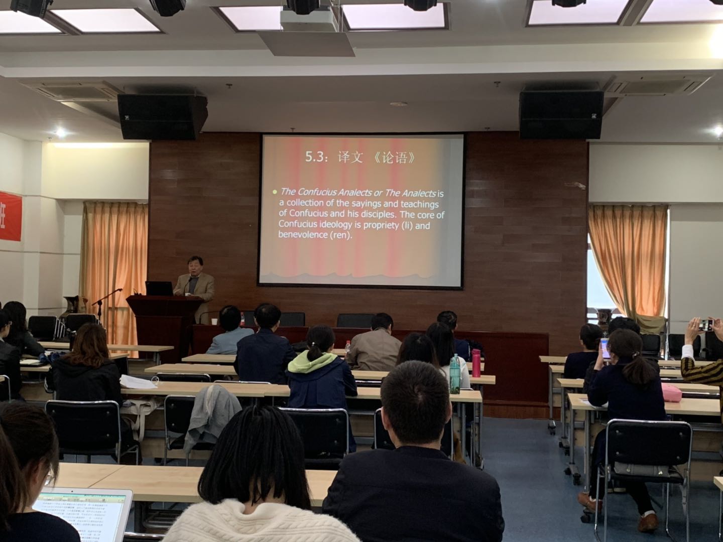 讲座期间,罗教授和在座的师生进行了热烈的问答互动,大家分别就中国典籍外译的译者群体、典籍翻译的接受性、异化与归化策略融通、文学翻译与国家形象构建等问题,进行了深入探讨。罗教授风趣幽默,寓诗情于讲释,借叙事以明理,博得了在座师生的阵阵掌声。讲座后,同学们反馈说收获颇多,表示今后要加强对我国文化经典的学习和理解,进一步提高跨语言交际中的文化自觉意识。