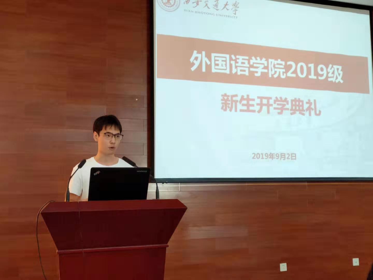 日语系青年教师时渝轩博士作为教师代表用幽默风趣的语言,鼓励新入校的同学不要浪费才华与青春,应该正视大学学习的意义,必是充实与忙碌,而非虚度与悠闲。同时道出教师们的努力都是为了服务于学生,希望大家不要虚度大学四年美好时光。