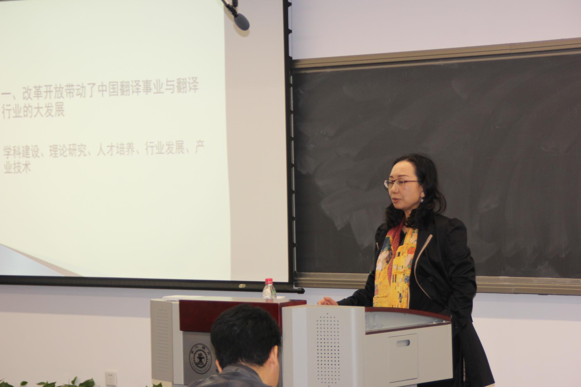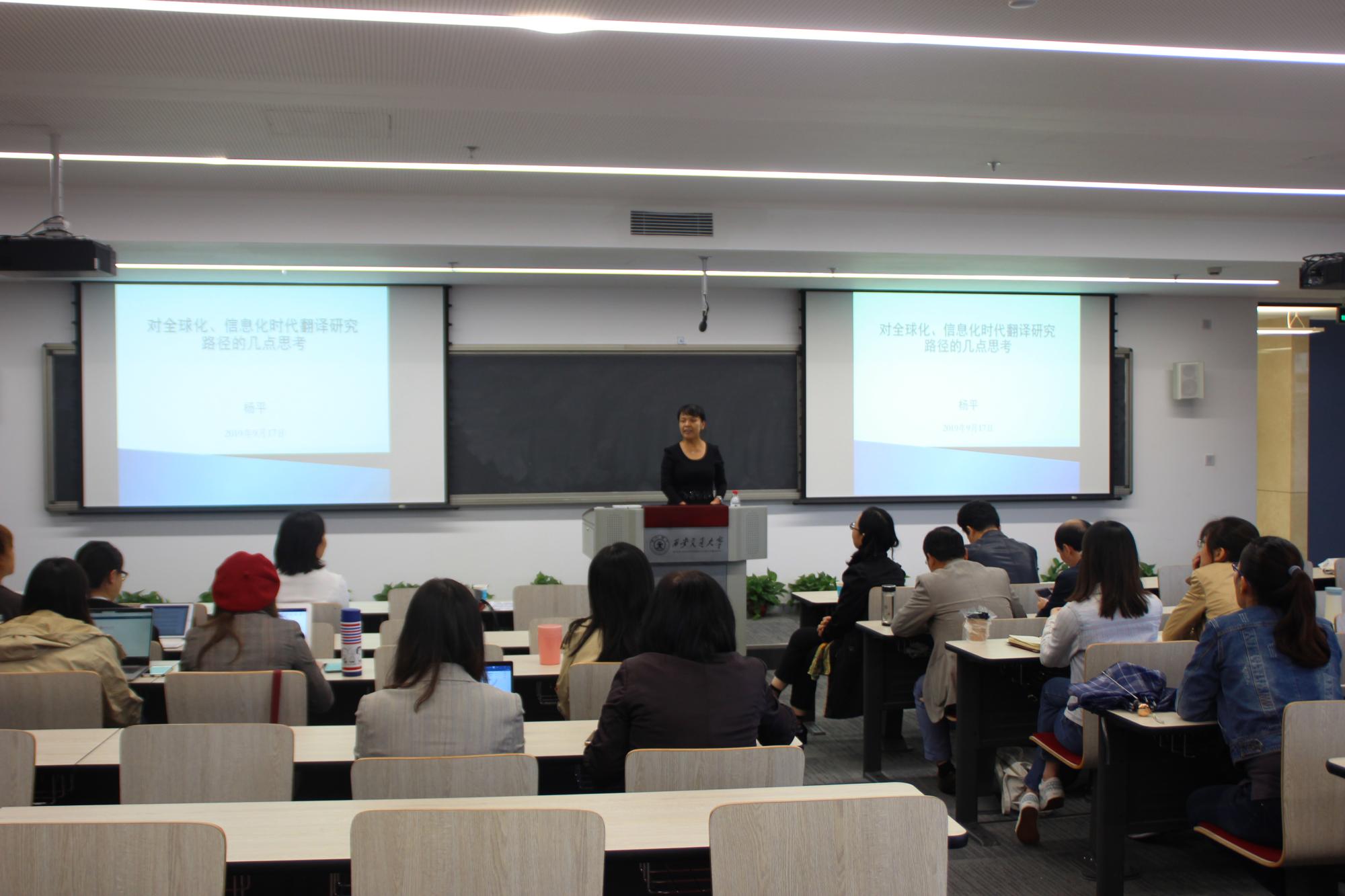 与国家外文局前期合作开展情况。会上,杨平老师从期刊主编的角度与师生交流中国翻译基本态势和《中国翻译》期刊投稿要求。她首先回顾了改革开放以来,中国翻译事业与翻译行业的大发展,具体体现在学科建设、理论研究、人才培养等方面,而这样的蓬勃发展与中国的发展是密切相关的。她强调,高校应注重“复合型应用型的高级翻译人才”的培养。