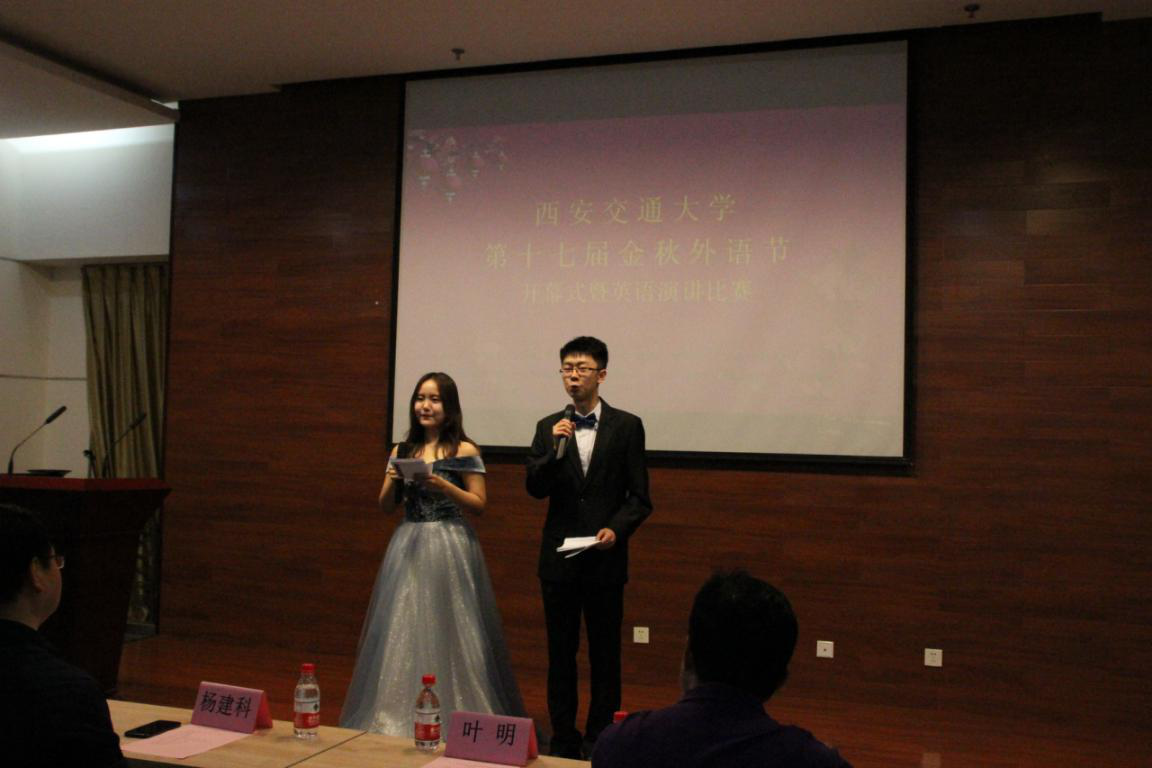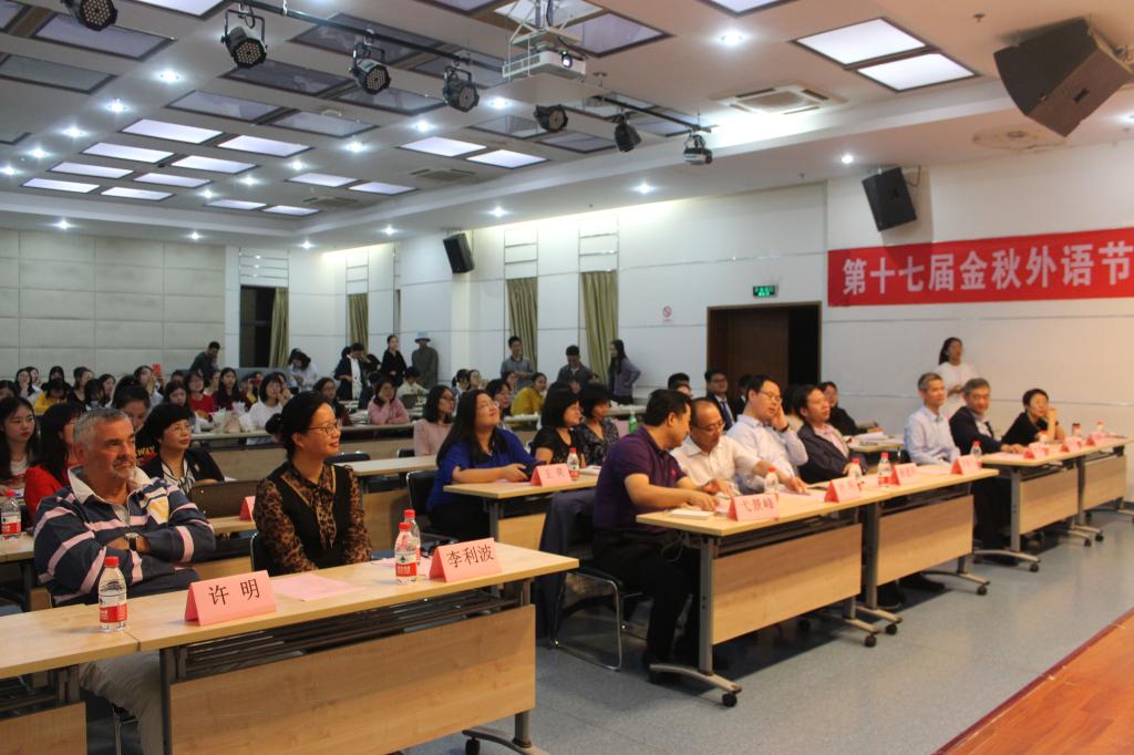 第十七届金秋外语节开幕式暨英语演讲比赛于兴庆校区外文楼1001报告厅隆重开幕。彭康书院院务主任叶明,学工部副部长李新安,教务处副处长杨建科,学校工会副主席弋景峰,团委副书记李利波,黑料网