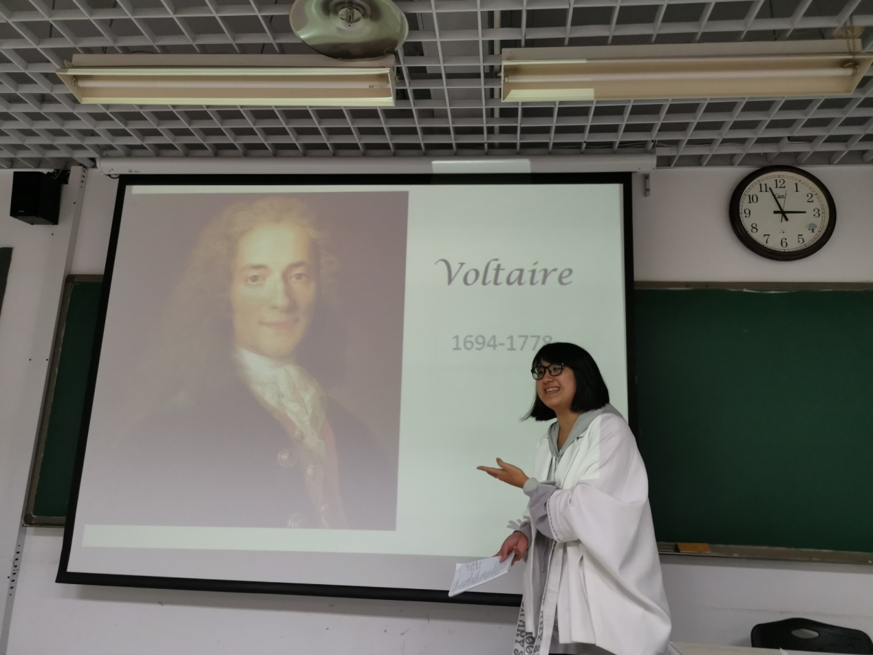 平时喜静的卢妙龑同学为大家带来了阵阵笑声。她讲述了“法兰西思想之王”伏尔泰的几件趣事,让紧张的比赛轻松了许多,我们发现了卢同学平时不为人知的风趣、幽默的一面。比赛为大家提供了展现不同风采的平台。