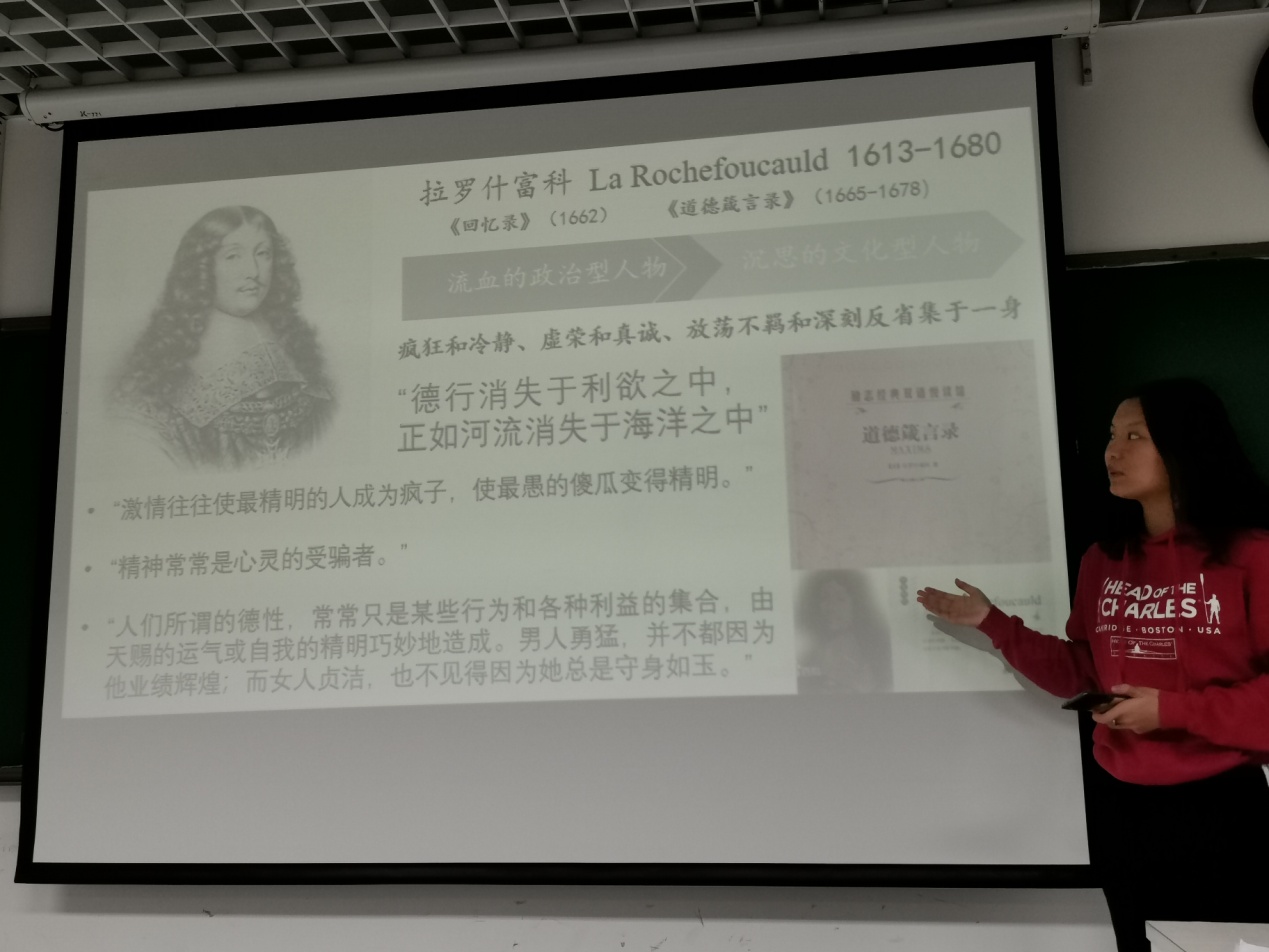 并列二等奖获得者王宇晞同学宣讲了17世纪著有《箴言集》的拉罗什富科。他是法兰西“伟大世纪”的一位佼佼者,这个“伟大世纪”也因他而万古流芳。这本《箴言集》为后世贡献了诸多格言警句: “精神的高雅在于思考那些善良和优美的事物。”“幸福在于趣味,并非事物本身。我们幸福,在于我们拥有自己的所爱,而不在于我们拥有别人觉得可爱的东西。”“朋友的优良品格在我们心目中的大小,和我们从他们那里得到的满足程度成正比,我们是根据他们同我们相处的方式来判断他们的价值的。”