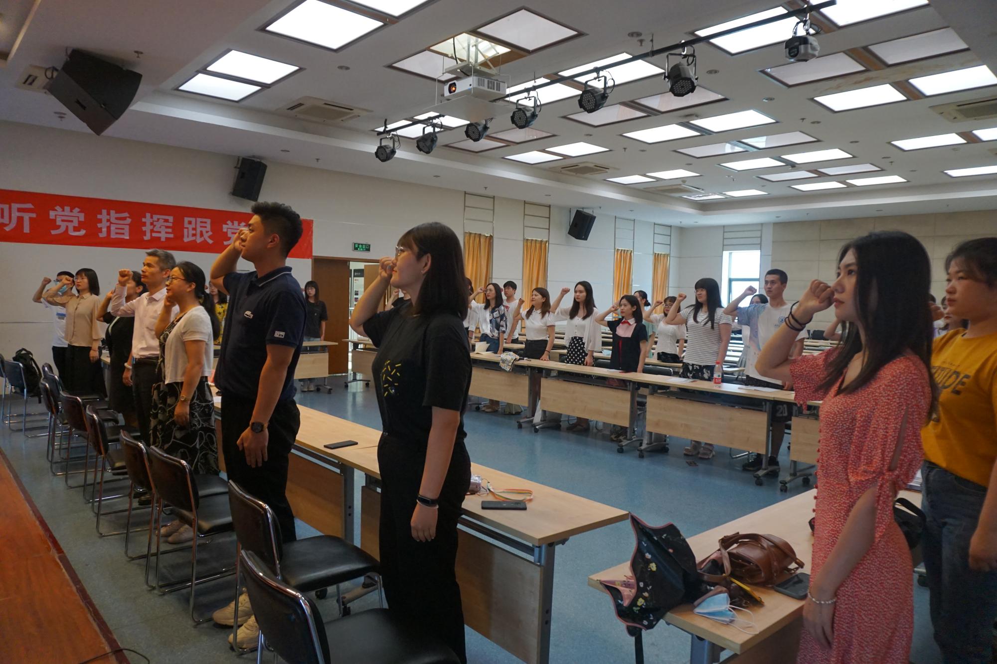在全体党员重温入党誓词环节,党员们举起右手、握紧拳头,在领誓人和智鹏的带领下,每位党员在党旗下庄严宣誓,再次强化了党员们的责任感,提醒着每位毕业生党员时刻牢记党员身份,永葆政治本色。