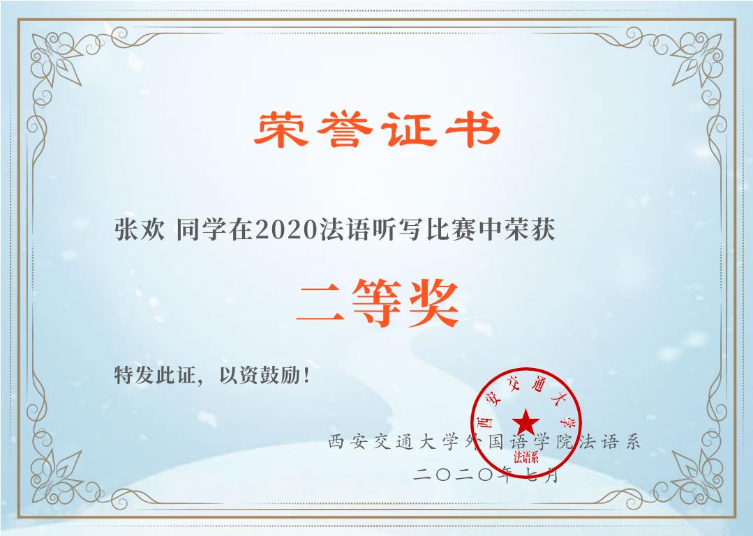张欢同学(二等奖): 感觉一段时间不练习就会手生,听的时候专注度要很高,而且要努力把每一个音听清楚听准确,我今天就把lampe听成了langue,听完需要仔细检查一下动词变位和前后配合的问题,避免基础性错误。彼此当少年,莫负好时光!继续加油!