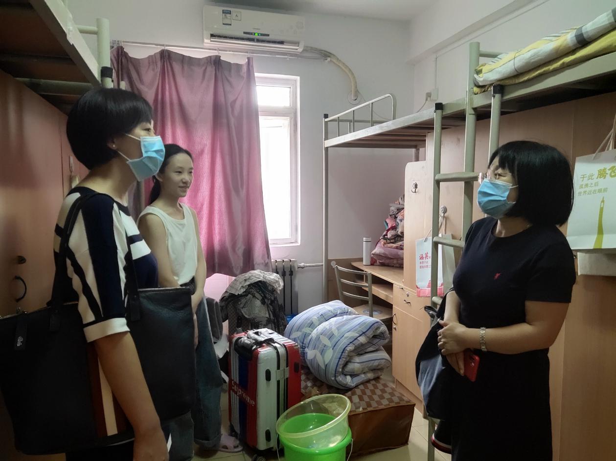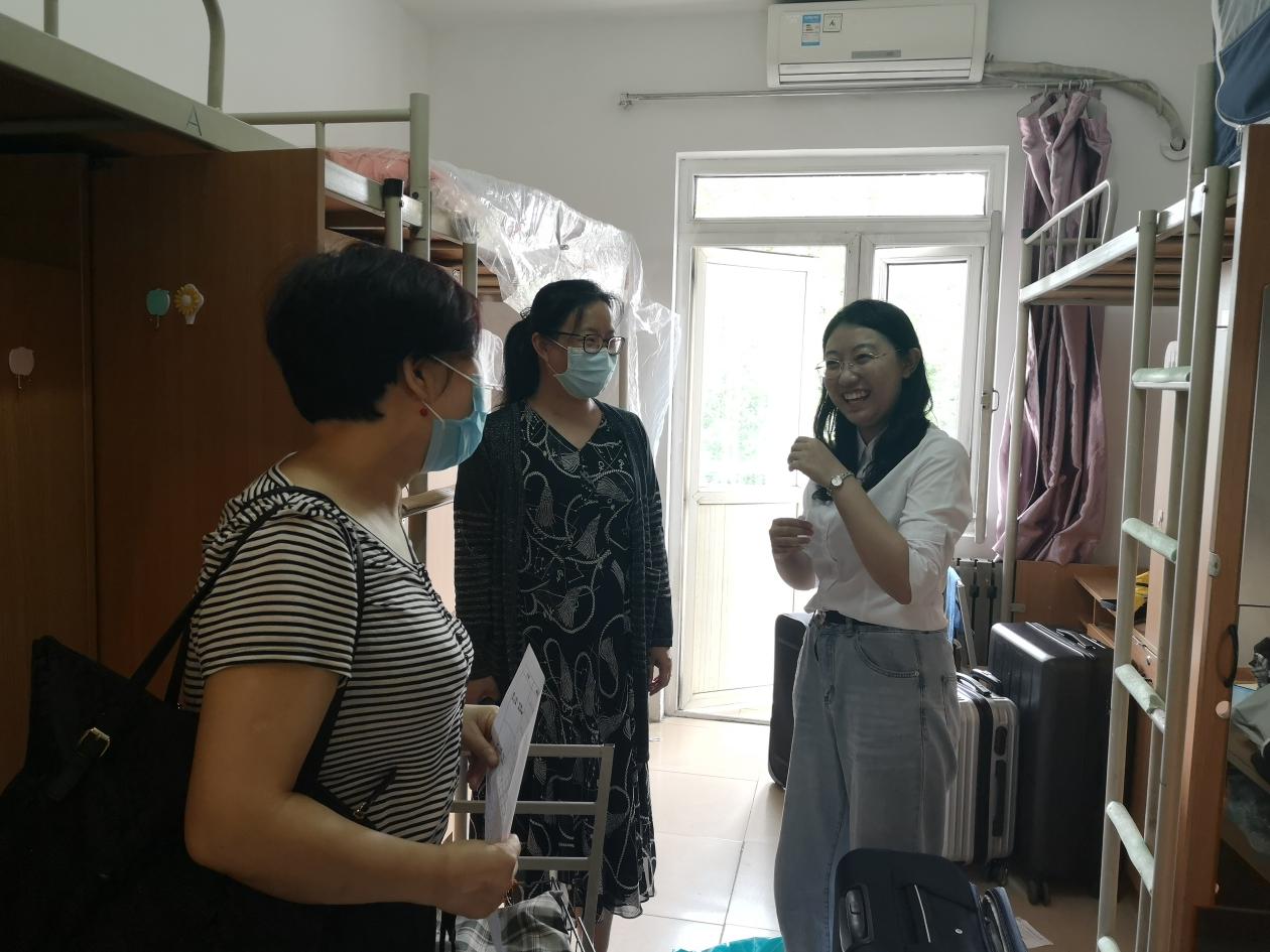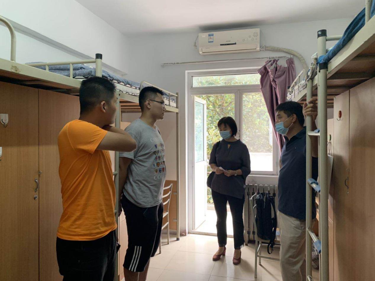 党委副书记许明、英语系主任杜丽霞、日语系主任张文丽、以及新生各班班主任、研究生辅导员在彭康书院院务主任助理朱宏伟、本科生辅导员温景涛的陪同下共同前往彭康书院东17舍学生宿舍,看望外语学院报到的2020级本科新同学。
