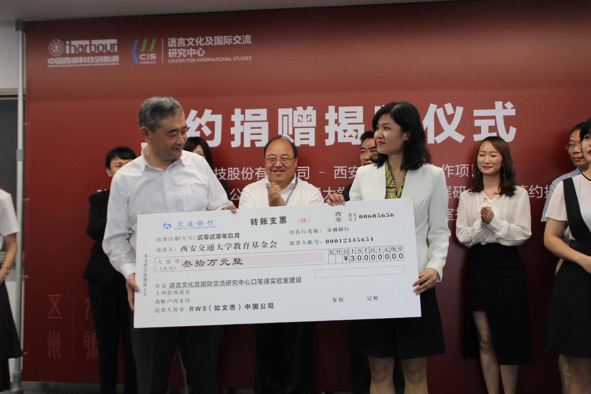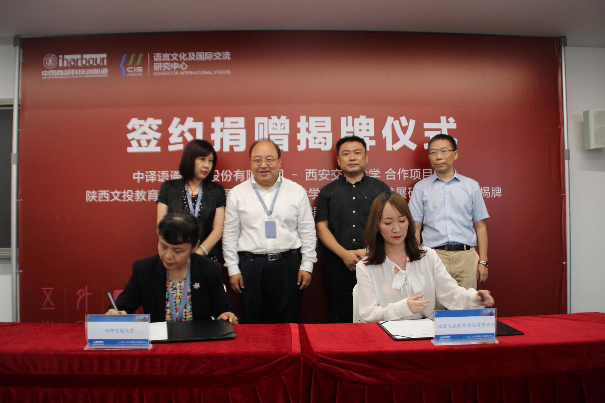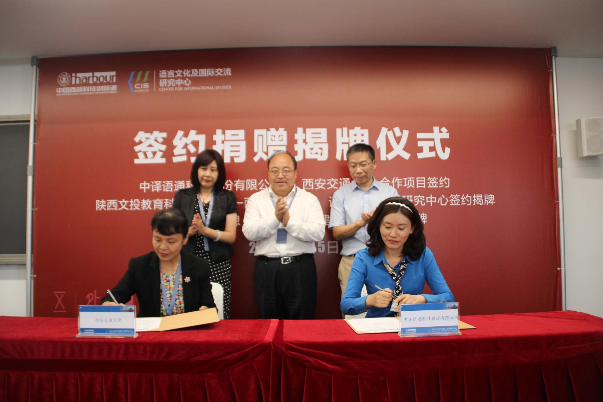 院长陈向京代表语言文化及国际交流研究中心,分别与中译语通科技股份有限公司、陕文投集团•文投教育公司的代表签署合作协议。之后,依次举行语言教育发展研究中心、口笔译实验室揭牌及捐赠仪式。