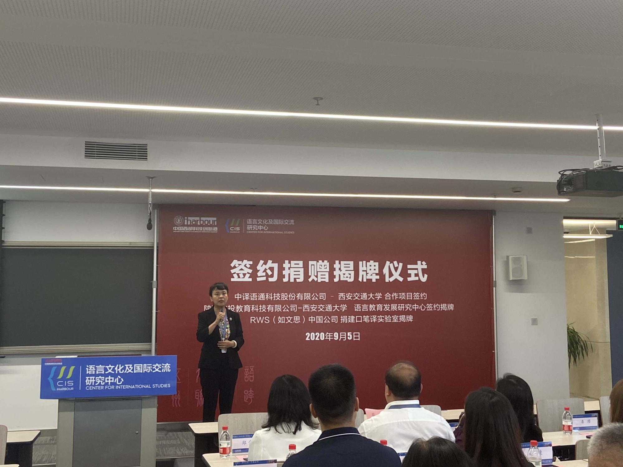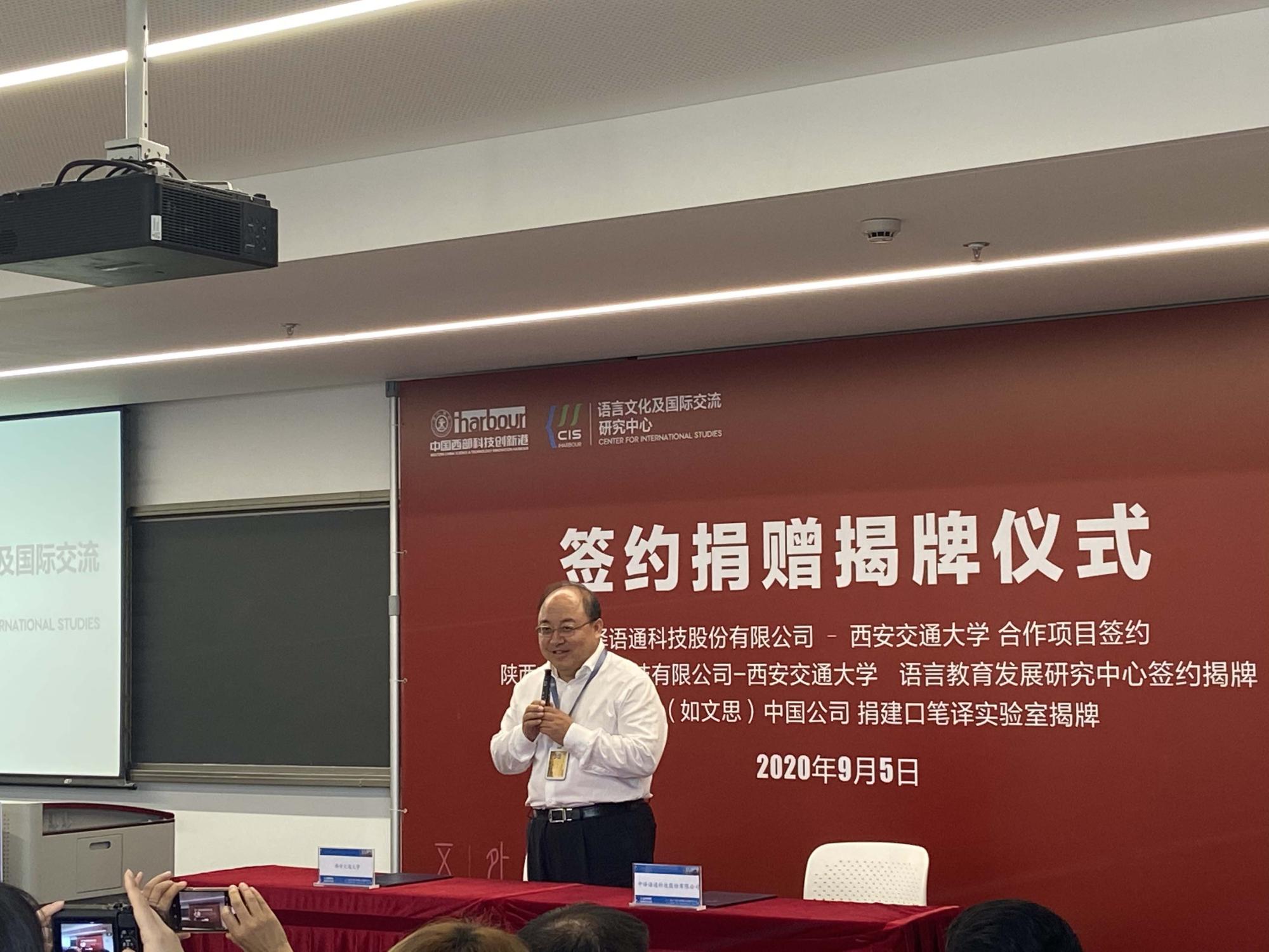 启动仪式结束后,语言文化及国际交流研究中心在涵英楼5-5107会议室举行了校企合作签约揭牌仪式,西安交大党委副书记宫辉出席仪式并致辞。
