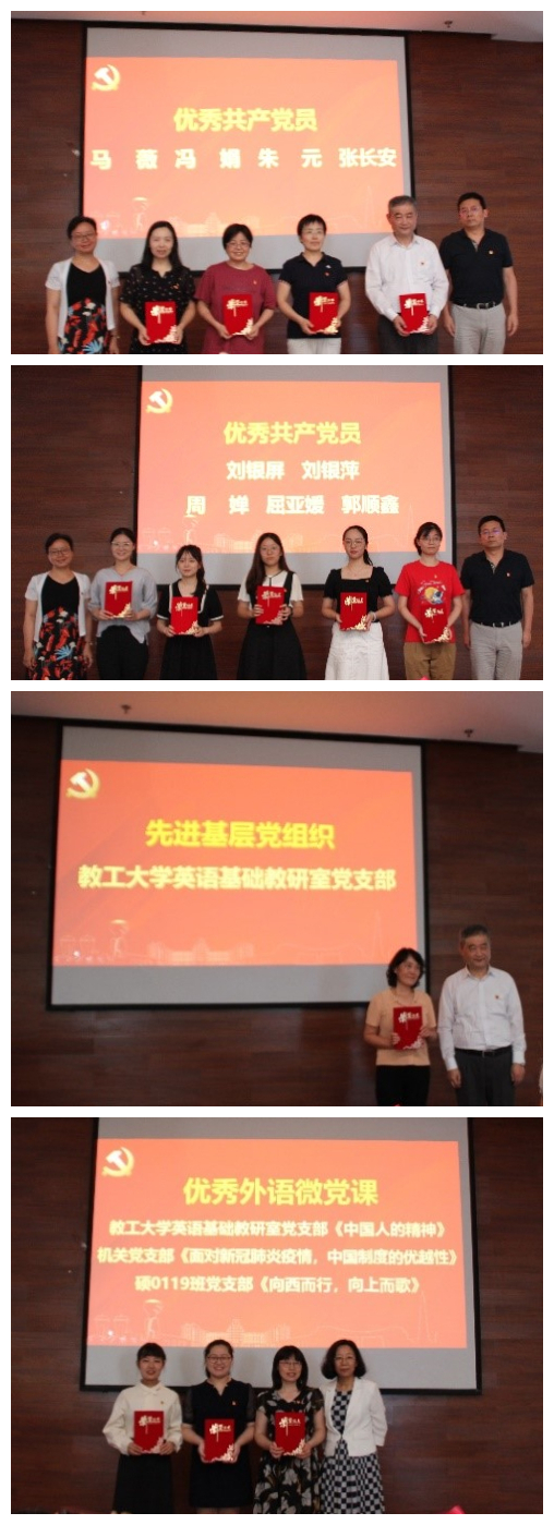 陈向京宣读学院党委表彰决定,此次共表彰9名优秀共产党员、1个先进基层党组织、3项优秀外语微党课。陈向京对为学院奠基和奉献的各位前辈和老师表示衷心感谢,同时寄语各获奖同志和组织珍惜荣誉,谦虚谨慎,在今后的工作学习中再接再厉,不忘初心使命,发挥共产党员先锋模范作用,勇挑重担,立德树人,为全面推进学院发展实现双一流奋斗目标做出更大的贡献。