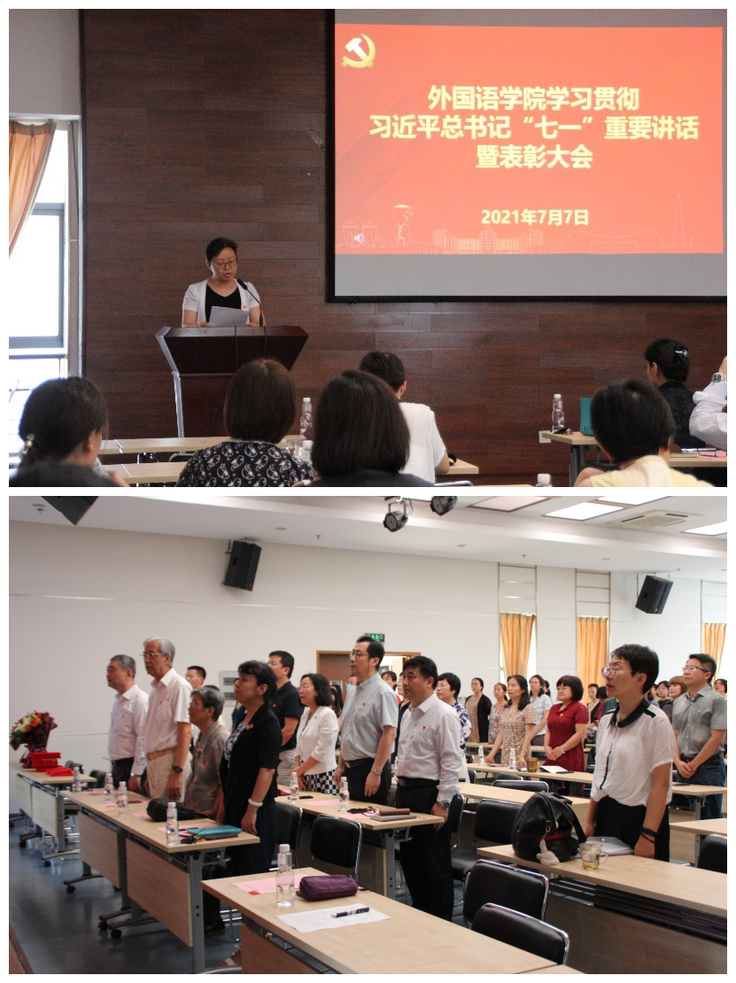 召开学习贯彻习近平总书记“七一”重要讲话暨表彰大会,学院党政领导、“光荣在党五十年”老党员、“两优一先”受表彰人员、系(中心)主任、民主党派代表、新发展党员代表、师生党支部书记、师生党员齐聚外文楼B1001报告厅。会议由学院党委副书记许明主持。