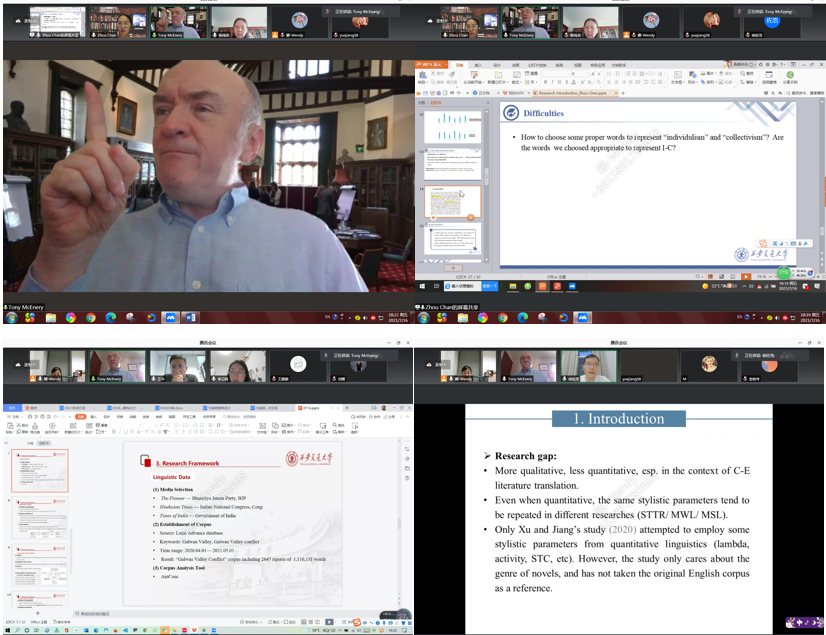 各小组分别就目前开展的词汇语义变化、印度对华边境政策的议程构建、《离骚》多译本比较等研究进行了详细汇报。McEnery院士认真听取了各组的汇报,就其优势和不足进行了点评,并就研究中的具体问题和难点进行了回答和指导。