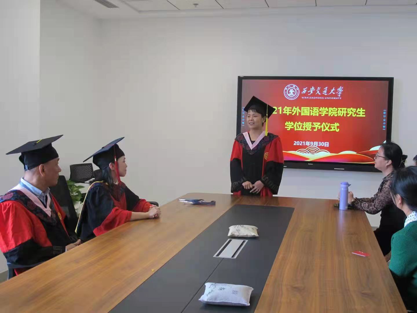 接着,蒋新蕾同学发表感言。她感谢母校和学院的培养,感谢导师的栽培,各位老师的悉心指导,以及同学们的帮助。她表示,自己的今天离不开母校,离不开学院,离不开各位贤师。她希望未来能回报母校,回报学院,为外语学科的发展贡献自己的微薄之力。