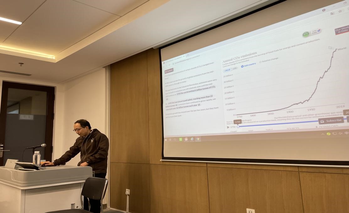讲座伊始,秦老师介绍了气候变化的现状及产生的后果。秦老师用了很多形象生动的图表展示了全球今年碳排放量的变化、各国碳排放量的对比等,通过不同维度的比较和分析让大家直观地了解了当今气候变化问题的严峻性和解决这一问题的急迫性。