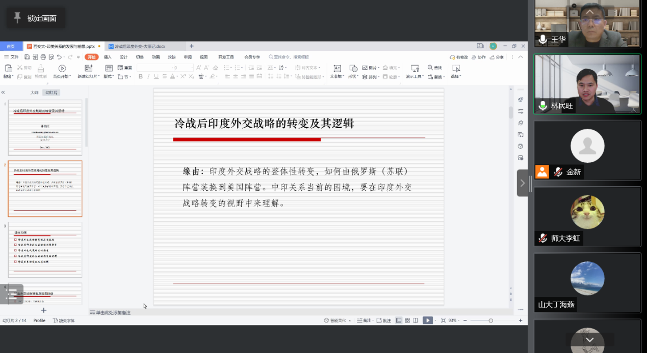 12月12日晚,外国语言文化论坛第205讲暨国别与区域研究系列讲座第8期以腾讯会议形式线上举办。本次论坛的主题为“冷战后印度外交战略的转变及其逻辑”,由复旦大学南亚研究中心副主任林民旺研究员主讲。论坛由副院长王华教授主持,学院部分教师、多个学院研究生以及国内多所高校师生近二百人线上聆听了报告。