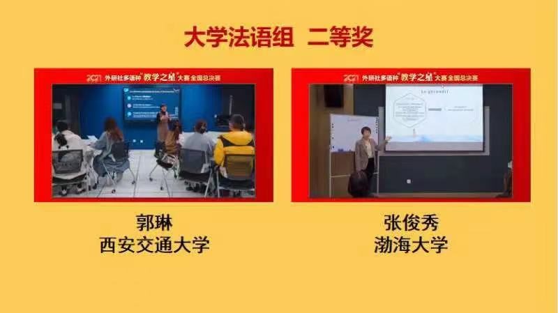 法语系郭琳老师、孟丽娜老师经过复赛、决赛的激烈角逐,最终以优秀的表现获得了本次大学法语组全国总决赛二等奖及优秀奖。