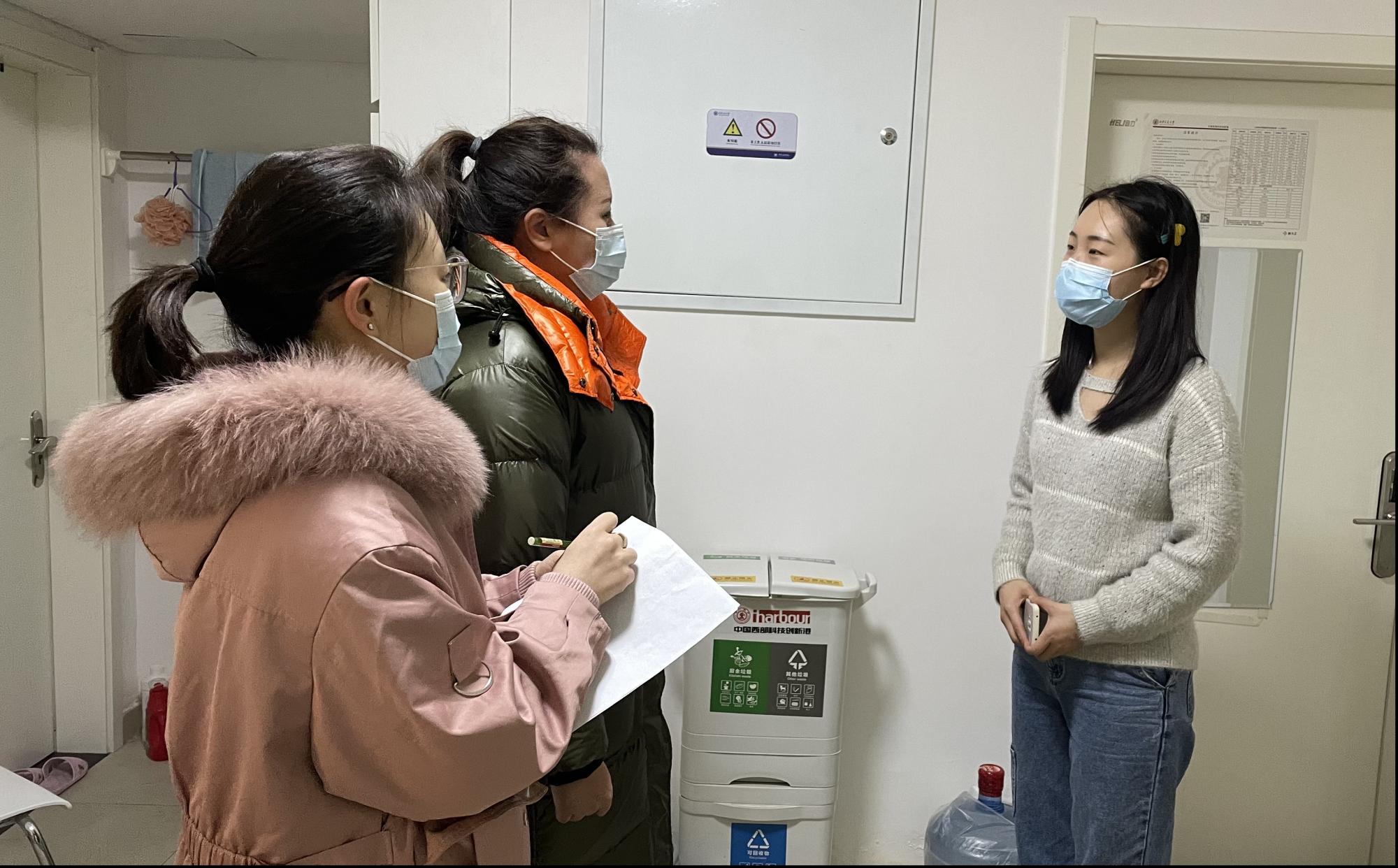 “最近感觉怎么样?” “疫情有没有给大家的学习和生活带来什么影响?”走访宿舍的过程中,薛老师亲切地询问大家的近况,关注疫情下同学们的心理状态,也提醒同学们要注意寝室卫生,养成多通风的好习惯,多参加体育锻炼,努力提高自身的身体素质。有同学就能否回家过年和封校后快递的收发等问题提出了自己的担忧,老师一一进行了解答,并鼓励大家保持良好心态。