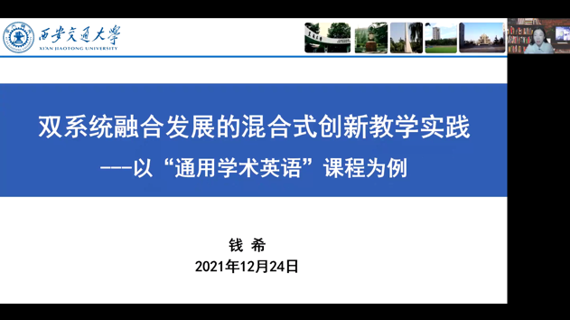 混合式教学专题云端分享会”,钱希副教授和邹郝晶副教授分别作题为“双系统融合发展的混合式创新教学实践—以通用学术英语为例”和“外语类混合式一流课程建设逻辑和推进路径—以英语辩论为例”的主题报告,全院40余位教师在线聆听讲座。