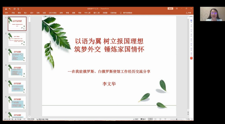 除了按时保质授课之外,学院导师丝毫没有放松对学生的指导,通过多种形式丰富学生的课外学习和实践。邀请曾在驻俄罗斯、白俄罗斯使馆工作的李文华副教授为翻译专业硕士生作题为“以语为翼,树立报国理想;筑梦外交,锤炼家国情怀”线上报告,2021级学生为讲座进行交替传译,相关导师全程参加并对学生翻译进行点评指导。