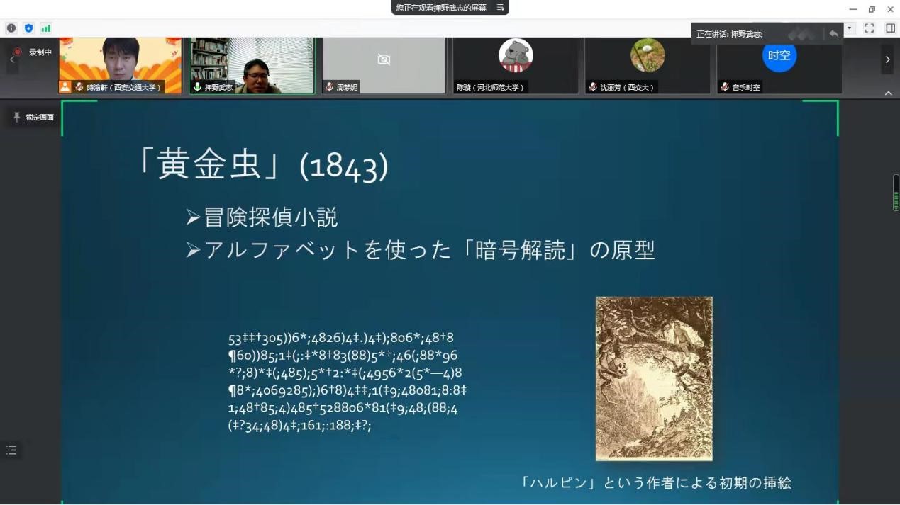 押野武志老师首先以埃德加·爱伦·坡、柯南道尔等作家的侦探小说为例,对西方侦探小说的成立及其时代背景做了细致的梳理,指出西方早期的侦探小说为日本侦探小说的发展提供了诸多母题。押野老师随后对黑岩泪香、江户川乱步的大量侦探小说中所使用的推理模式做出分析,继而强调:日本的侦探小说并非西方侦探小说的挪用,而是借由“翻案”实现了日本独特的侦探小说发展模式。某种意义上,日本侦探小说的自发性发展(本格推理与变格推理),恰恰是建立在对西方侦探小说“规则”的破坏之上。