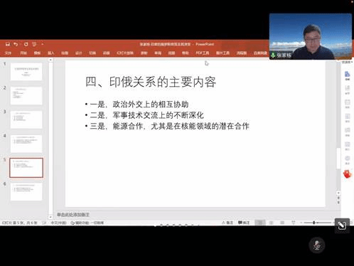 张家栋老师从印俄关系的历史、印俄之间的共同点、当前印度战略视野中的俄罗斯、印俄关系的主要内容、印度对俄政策的发展趋势五个方面进行了讲解。在回顾印俄关系的历史时,张老师分别从殖民地时期、印度独立和冷战时期、冷战后、1998年核试验之后以及俄乌战争爆发后讲述了印俄整体友好合作关系的演进历程。他指出印俄关系的发展与两国之间具有共同的反西方心态、类似的地缘环境、类似的发展阶段、共享的世界领导者梦想等共同点密切相关。当前印度视俄罗斯为可靠但重要性下降的战略合作伙伴,以及其武器和技术的重要来源,但印度自身与俄罗斯的战略视角差异不断扩大。张老师认为当前印俄关系主要以政治上的相互协助、军事技术交流上的不断深化以及能源合作(尤其是在核能领域的潜在合作)为主要内容。最后,张老师指出未来俄罗斯对印度的重要性会继续下降,印俄关系会向对印度有利的方向发展,印俄继续走近的空间和必要性有限。