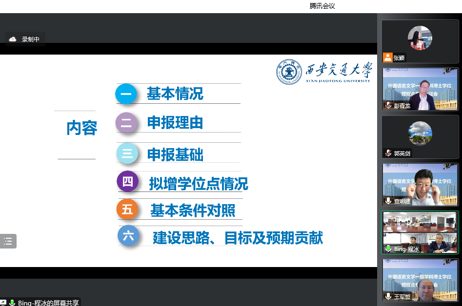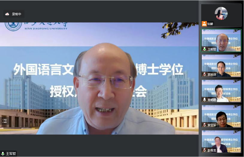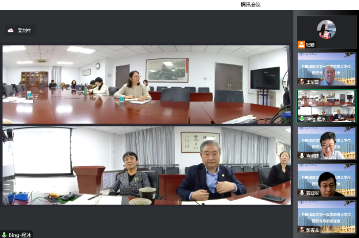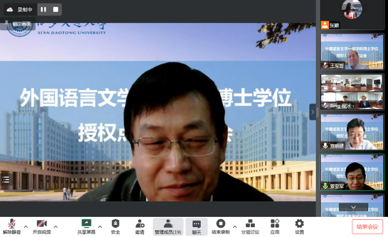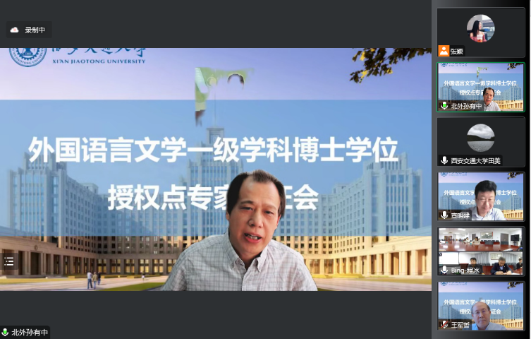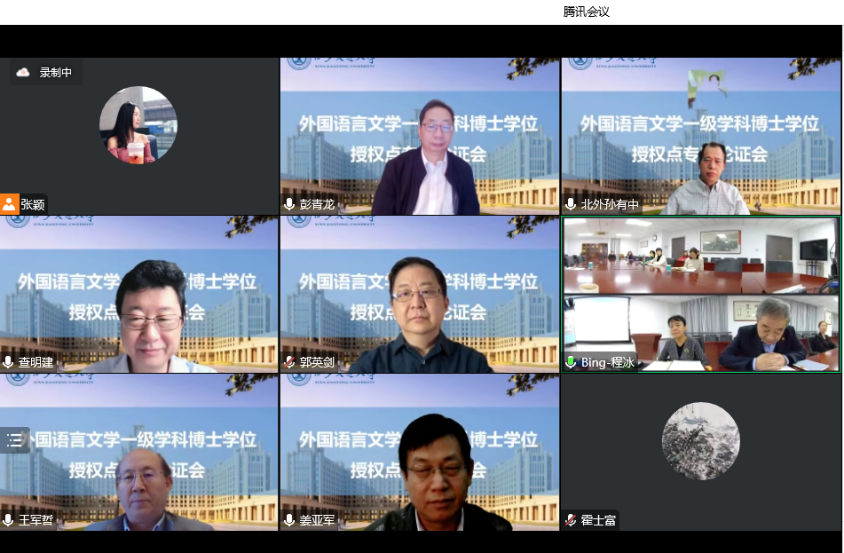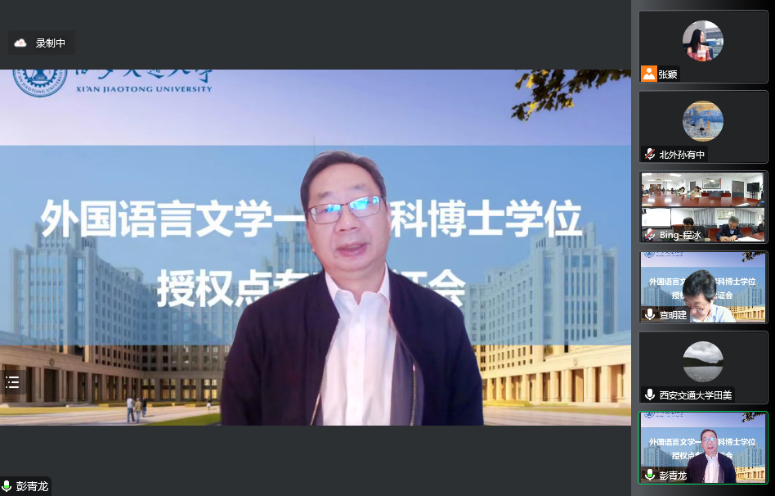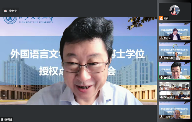 外国语言文学一级学科博士学位授权点专家论证会以线上线下结合的形式召开。出席论证会的专家有外国语言文学学科评议组召集人、上海外国语大学查明建教授,外国语言文学类专业教学指导委员会主任委员、北京外国语大学孙有中教授,外国语言文学学科评议组成员、上海交通大学彭青龙教授,外国语言文学学科评议组成员、中国人民大学郭英剑教授,外国语言文学类专业教学指导委员会委员、日语分委员会副主任委员、西安外国语大学王军哲教授,外国语言文学类专业教学指导委员会委员、英语分委员会副主任委员、西安外国语大学姜亚军教授和黑料网
