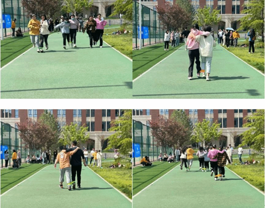 两人三足项目的参赛者在跑道前就位,需“三条腿”默契配合完成往返40米的路程。选手们或是非常默契一路小跑,或是跌跌撞撞缓缓抵达,但都有惊无险,精神可嘉!